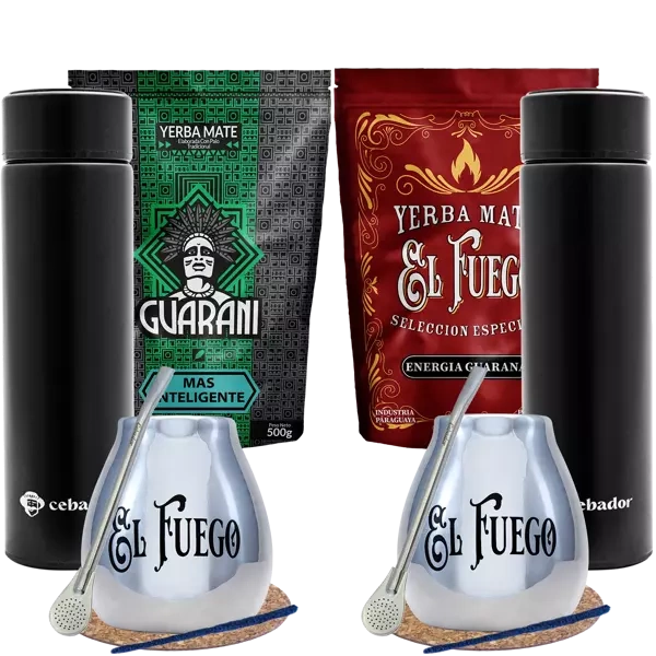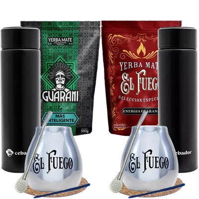 Set de Yerba Mate para dos: El Fuego 2x500g + 2x Termo LED + 2x Calabaza + 2x Bombilla