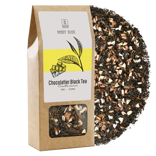 - El té Mary Rose Chocolatier es una combinación aromática de té negro de yunnan con chocolate. Entre las hojas de té negro, brillan maravillosamente grandes copos de tres tipos de chocolate: blanco, con leche y negro.