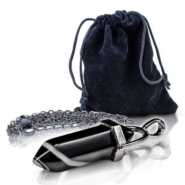 Forma: ágata negra tallada en montura metálica (con cadena), empaquetada en bolsa negra