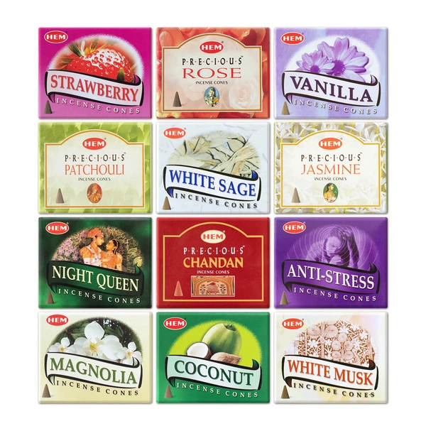 - Un conjunto de inciensos cónicos HEM en 12 variantes aromáticas. Perfecto para la relajación, la limpieza energética y la creación de un ambiente único. Ideal para el té de la tarde, la yerba mate o la meditación.