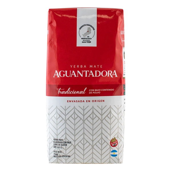 Aguantadora Elaborada Con Palo Tradicional es una yerba mate sin aditivos, famosa por su inusual forma de procesar sus hojas. La yerba mate se seca brevemente sin humo. Como resultado, el producto tiene un sabor y aroma clásico, ligeramente amargo, y un alto contenido de cafeína. Recomendado para los amantes de la yerba mate natural sin aditivos.