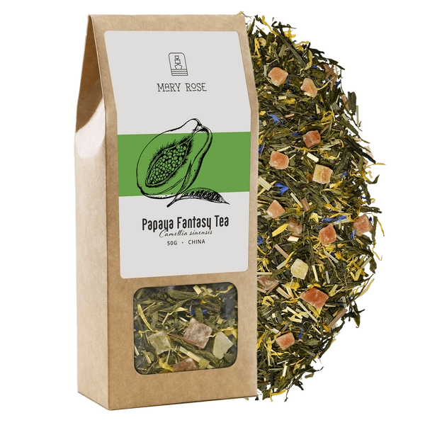 - Mary Rose Papaya Fantasy es una composición a base de té verde sencha y aditivos de frutas y hierbas perfectamente seleccionados. Destaca aquí, en particular, la papaya confitada, que aporta una nota aromática de dulzor a la composición.