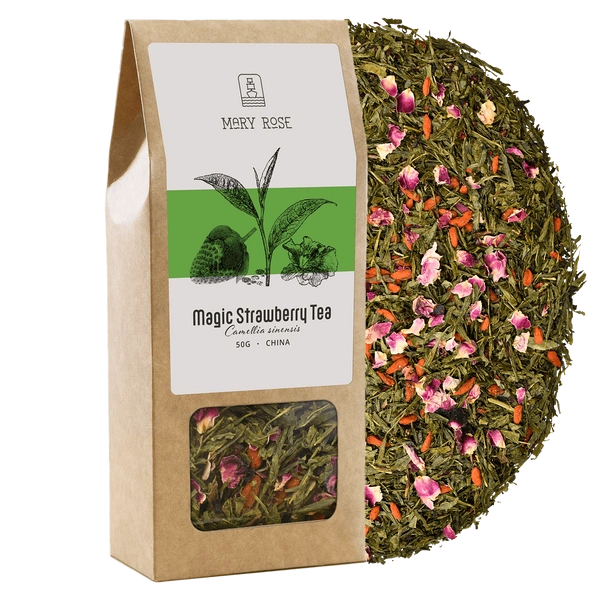 Mary Rose Magic Strawberry es una combinación de té verde sencha y varios ingredientes naturales. Entre ellos, destaca la fresa . Su dulzor característico se ve interrumpido por la acidez del hibisco y los pétalos de rosa delicadamente especiados.