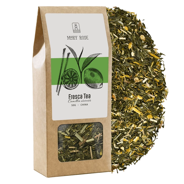 - Mary Rose Fresca es una combinación muy sabrosa, fragante y crujiente de té verde sencha y aditivos de hierbas y frutas: limoncillo, refrescante menta, ralladura de limón, ralladura de lima y pétalos de caléndula.