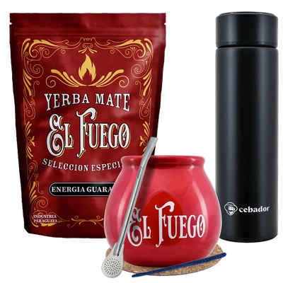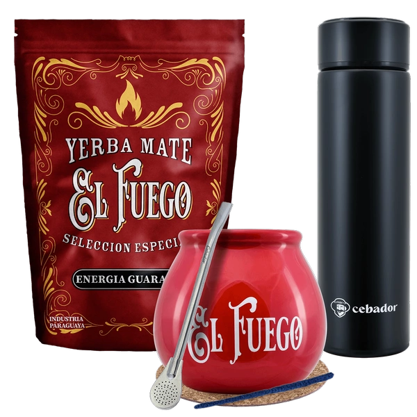 Set de Yerba Mate para dos: El Fuego 2x500g + 2x Termo LED + 2x Calabaza + 2x Bombilla