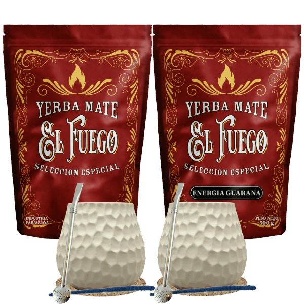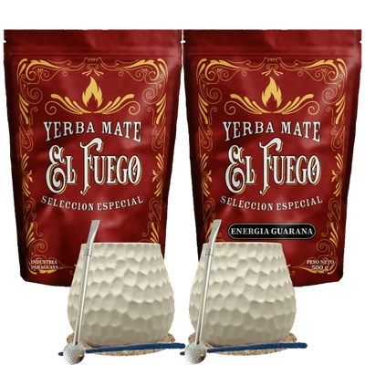 Set de inicio para dos personas Yerba Mate El Fuego 2×500 g + 2× Calabaza + 2× Bombilla